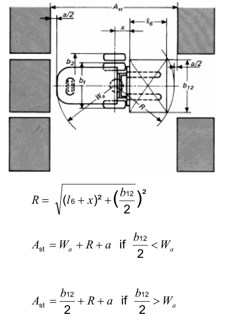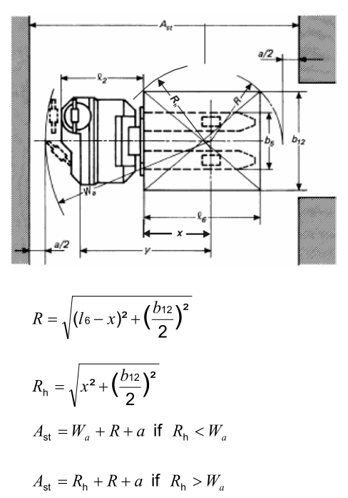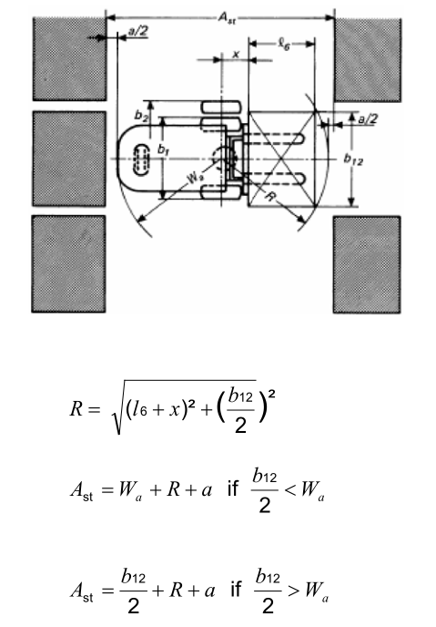 一、首先根據叉車的具體(ti) 類型與(yu) 存儲(chu) 單元的規格尺寸,計算叉車繞轉動中心轉動時所需的空間尺寸Wa和R。