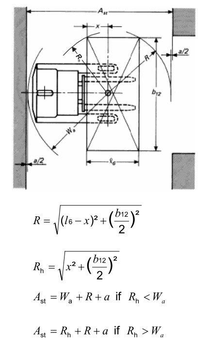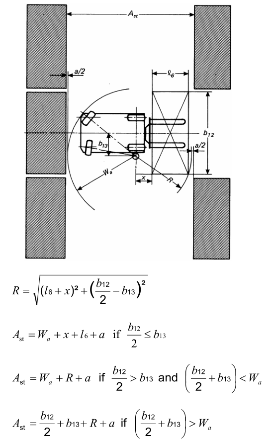 歐洲行業(ye) 標準FEM 4.005(E),規定了幾種主流類型的工業(ye) 叉車進行90°堆垛時,對巷道寬度的要求。